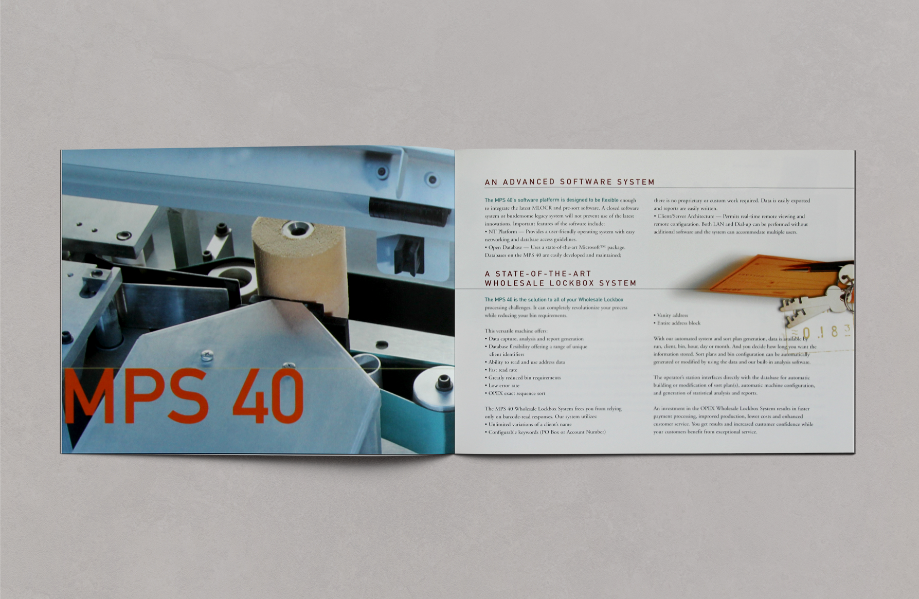 “Designing for Opex Corporation, a company that made large scale mail sorting machines, was always a great experience. They were open to experiment with colors, paper and images to create interesting tactile bochures that made their machines transcend their utilitarian functions, and celebrate their beauty. This brochure was desinged to make this massive machine that filled a whole room seem like a sexy car.